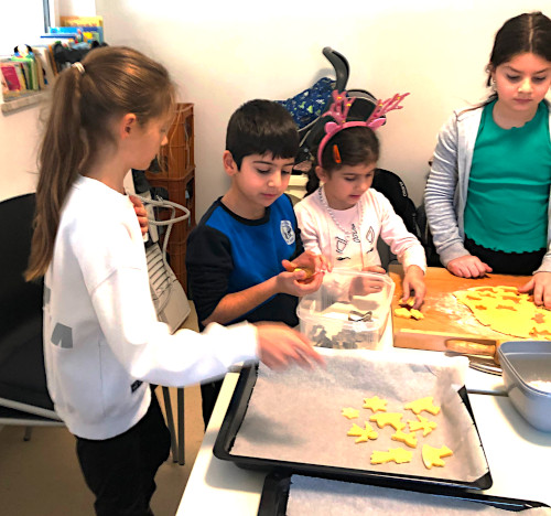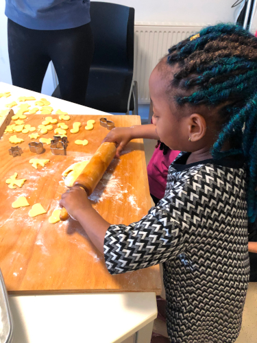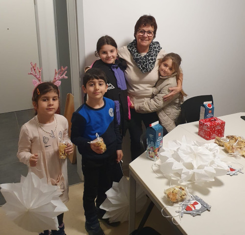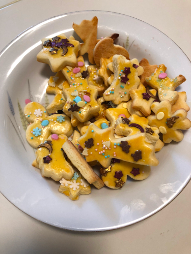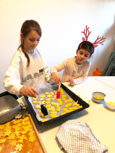 Gesagt, getan, Teig vorbereitet, Bastelsachen gerichtet, Kids eingeladen und eingeladen (also mitgenommen) in die Back- und Bastelstube Schlossmatten. Das Schönste zuerst: Es waren alle Flüchtlingskinder mit dabei. Entsprechend turbulent ging es zu: Ausrollen, ausstechen, anpinseln, backen, verzieren und !!! probieren. Da brauchte wohl der ein oder die andere Weihnachtsbäcker/in kein Abendbrot mehr. Bei Punsch und Plätzchen (es gab auch einen großen Teller mitgebrachte Weihnachtsbrötle) wurden Tütchen mit dem selbst gemachten Buttergebäck abgepackt, damit jede/r eines mit heimnehmen konnte. Jetzt waren aber immer noch Plätzchen übrig. Die Kids waren einhellig der Meinung, dass diese den Kindern in der Flüchtlingsunterkunft „Sonne“ geschenkt werden sollten – eine tolle Geste!