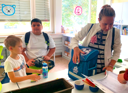 Meine Mama hat damals gesagt: „Jetzt beginnt der Ernst des Lebens!“ Gemeint war der Beginn der Schulzeit. Aber was sich so ein bisschen anhört wie eine Drohung, ist zumindest am Tag der Einschulung (noch) mit viel Freude und Stolz und erst Mal mit ganz viel Aufregung versehen. Vladislav, mit seiner Mutter und seinem Bruder aus der Ukraine geflüchtet, hatte bei schönstem Herbstwetter seinen ersten Schultag und war natürlich „stolz wie Harry“. Mit Mama und großem Bruder (und Angelika von merdingen-hilft) wurde ein schöner Tag verlebt und es gab sogar kleine Geschenke.
