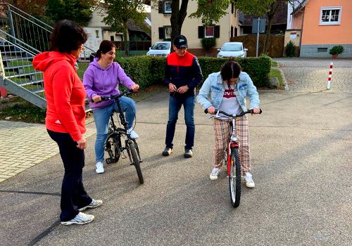 In und um Merdingen ist ein Fahhrad aber ungeheuer praktisch, damit man*frau flott von A nach B kommt, Besorgungen und Termine besser wahr genommen werden können und natürlich auch als Freizeitspaß. Die meisten Geflüchteten haben Dank entsprechender Spenden inzwischen ein Fahrrad. Aber was nützt so ein hübsches Velo, wenn ich nicht fahren kann oder Angst habe, weil ich zu unsicher bin. Deshalb haben wir einen kleinen Fahrradkurs für die Frauen mit Hilfe des Radsportvereins organisiert. Die ersten „Fahrradstunden“ haben schon auf dem Schulhof stattgefunden. Aller Anfang ist schwer, aber es geht bzw. es fährt voran. Etwas Geduld und Übung bedarf es noch, aber es wird. Mit der Radsportkarriere im RV Edelweiß wirds bei unseren Frauen allerdings wohl nichts mehr, aber in nicht allzu ferner Zeit werden sie sicher in und um Merdingen herumradeln können. An dieser Stelle ein großes Dankeschön an unsere Fahrrad“instruktoren“, Armin und Martina Engist.